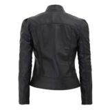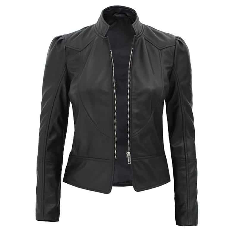 Have a look at this outstanding Amy womens black slim fit leather jacket. It is 100% lambskin leather that looks perfect when you wear it. The inner skin-friendly viscose lining gives a cozy feeling while wearing this fantastic jacket. It has an elegant finishing topped up with a stand-up collar that makes it look even catchier. You can wear it in both formal and casual attire to look stylish.
