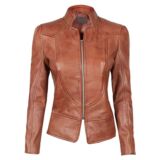 This Amy womens brown fitted leather jacket is all that you need to look stylish. The shape that this amazing jacket has speaks for itself. The texture is also quite catchy, and this is why it has to be on your top picks. The inner skin-friendly viscose material makes it pretty comfortable to wear. Its stand-up collar with smooth zip closure gives us a fantastic look.