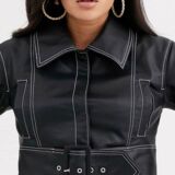 Black Leather Statement Belt jacket for women designed to clothe more stylishly. The comfortable women’s leather belt jacket are imperative to wrap up with any loftier or trouser in the wintertime. It includes a point collar, concealed placket, and Functional pockets of women’s leather garments make it an excellent substitute for every event. The short black leather jacket women have contrast stitching, belted waist, and cropped length. jacket women’s leather is a significant part of every woman’s winter vestments, especially in a regular fit. If you are enthusiastic about shopping for winter jacket for women, you must invest in a Black Leather Statement Belt jacket. However, long sleeves or short sleeves jacket engage us to purchase a made-to-measure cheap leather jacket for women. You will effortlessly impress the show by adding tailored leather women’s jacket on sale in your closet. To keep warm in the wind nips, order a tailored best leather jacket for women in your desired sizes, even in plus-size jacket and XXS.