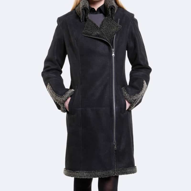 Black Long Shearling Coat For Women is master piece from our pure leather collection. The coat in black looks classy with front asymmetric zipper closure, comfy long sleeves. The Black Long Shearling Coat For Women is a classic long coat following the latest trend. Hurry up! Grab this regular fit, made to measure size shearling coat at affordable price from our online outlet to make your looks rocking.