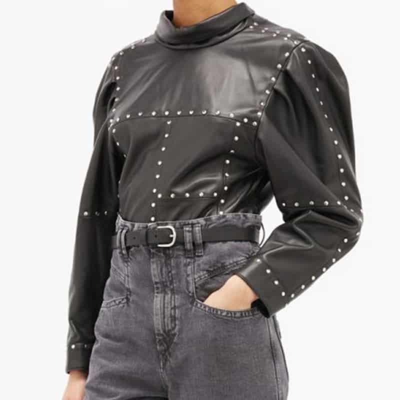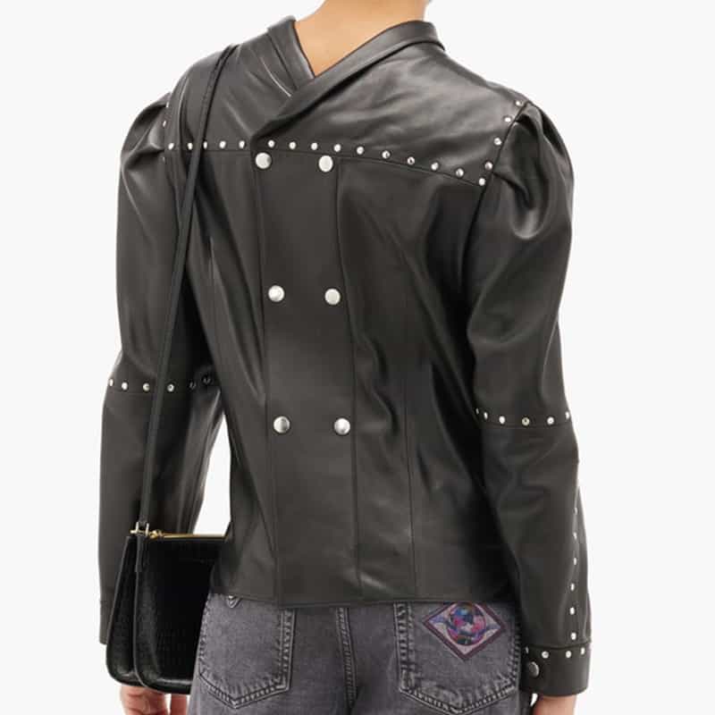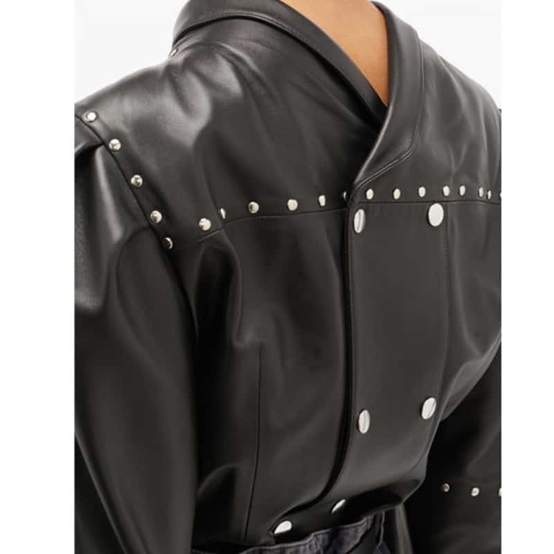 Are you looking for a unique outwear to carry this Halloween? You are just a few clicks away! We crafted a new attire for our buyers with a new look, the Black Studded Veneza Leather Top For Women. A masterpiece with pure leather material in glossy black color having exciting features, a front accentuated with silver studs design closure, and trendy rounded collar style followed by inner Pockets. It has long open hem sleeves, and this top can be wear on any dress code, such as shirts, jeans, dress pants, etc. The attire perfectly fits in size and quality stitching. Order now, and makes this Halloween excellent with this top.