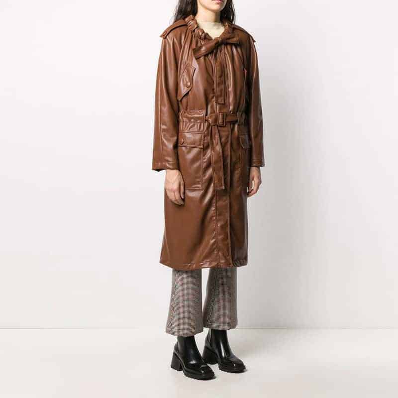 Enchanting Brown Faux/ Leather Trench Coat For Women is a long polyester coat with shiny, silken skin giving it a lovely look. The coat in brown polyester makes it look like a pro. It includes a front with a buttoned and belted closure, and a stylish round ruffled design collar, and long open hem cuff sleeves. The two inner pockets are adding more convenience to this outwear. You can wear this long trench coat with any dress code as it is an all-rounder outfit. Order now to avail this coat at your earliest.