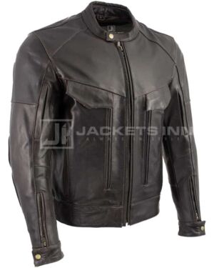 The flavor retro brown biker jacket is made from genuine leather with polyester lining and 100% cotton filling. The cool, slim-fit jacket comes with a hip-length front zipper closure and stands collar. The long adjustable cuffs and hem sleeves will keep you warm in rainy and cold weather. The jacket look is completed with two zipper chest flaps and outside pockets, and two inside pockets.