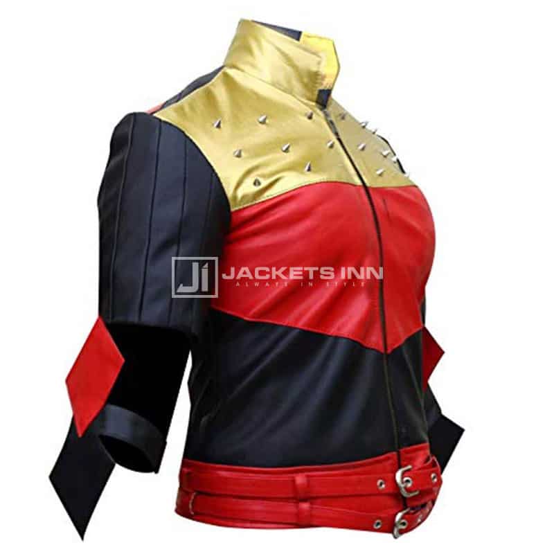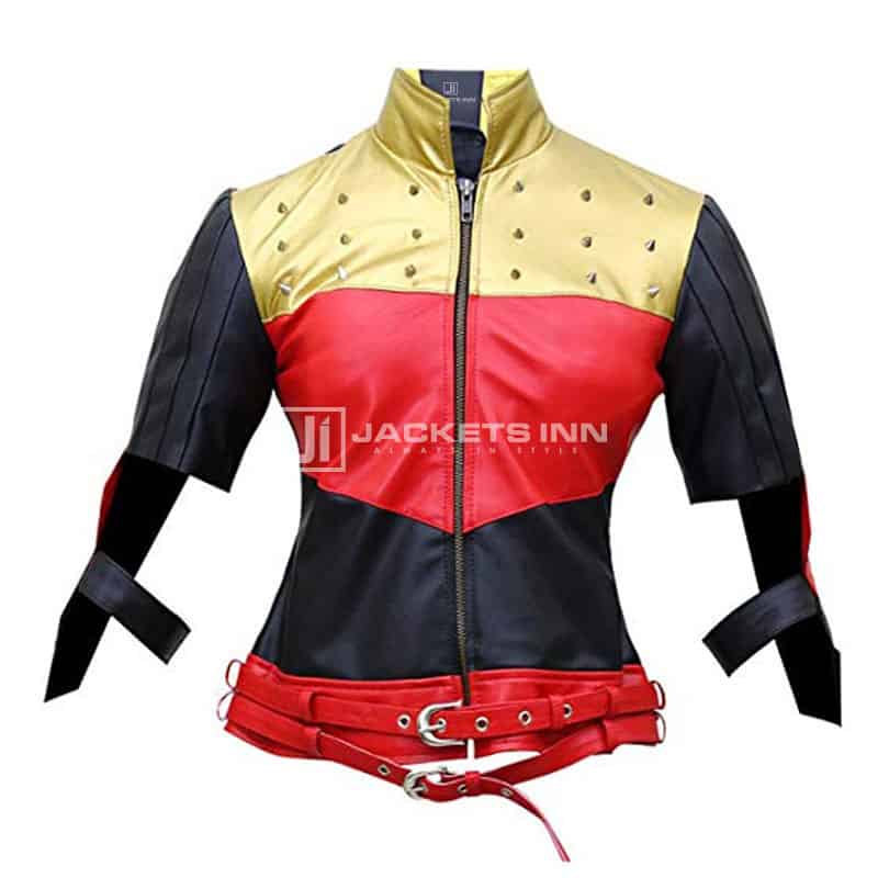 This Harley Quinn Injustice Leather jacket is the production of original leather comprising of an inner stitched viscose lining to keep you enjoyable. Its specifications feature an erected collar studs on the chest, belt on the hemline, a logo at the back, half sleeves with lining and straps as cuffs, and front zip closure.