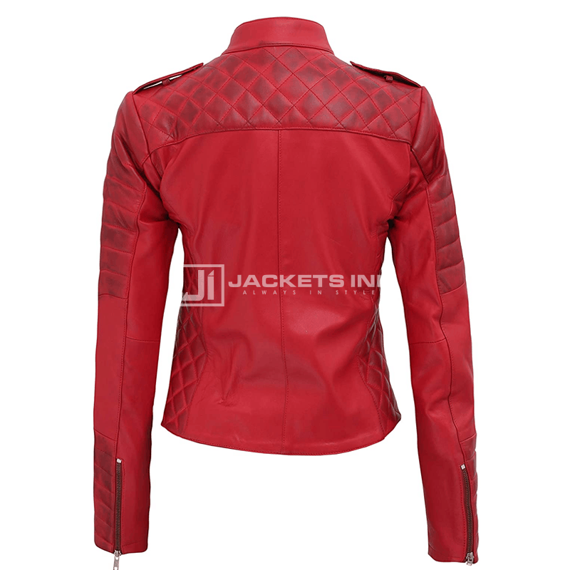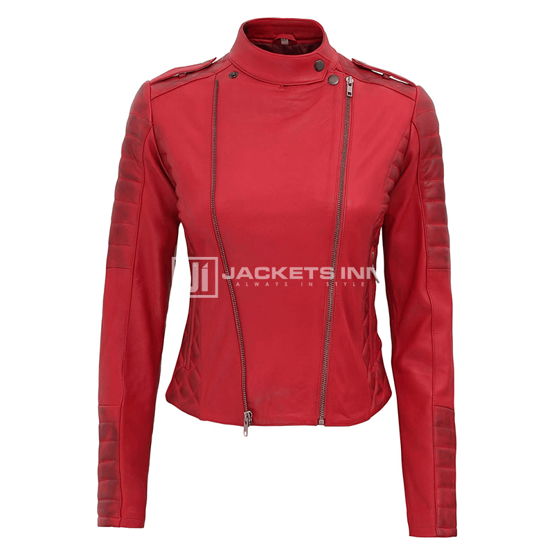 Add a refined touch to your Jannie red asymmetrical padded leather jacket with the highlighting sewed enumerating on the shoulders, abdomen, and sleeves. The genuine calfskin development and thick delicate design make this costume son red shading never go unrecognized. It is made of 100 percent authentic lambskin leather from the external and shows a soft, friendly viscose lining from the inside. The front, durable zip closure with outer and inner pockets adds more value to it.