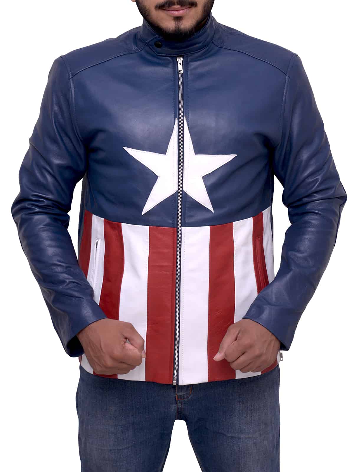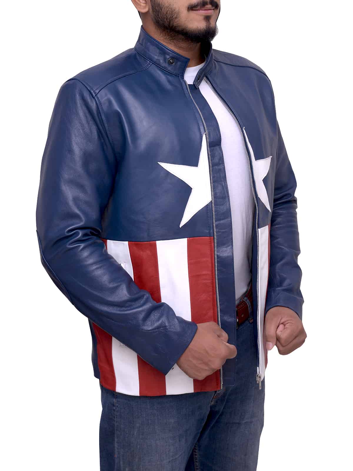 Jon Bon Jovi Captain America Style jacket is designed for men who want to dress up exclusively. Grey, black and white leather jacket are a go-to essential for everyone who want to look like a gentleman. dark blue leather jacket mens are made from the original leather with Viscose Lining and snap tab collar. Blue fitted jacket has Full-length sleeves, Front: YKK Zipper for Front Closure and Two Pockets On the Outside at Waist Length. If you are wondering where to buy mens jacket in a tailored fit, then you must prefer us. Be it a semi-casual party or corporate event, you can purchase grey, black and burgundy leather jacket to look sharp. By purchasing lined leather jacket, you can speak volumes of professionalism. We provide full and sleeveless leather jacket in different sizes including XXS, big and tall.