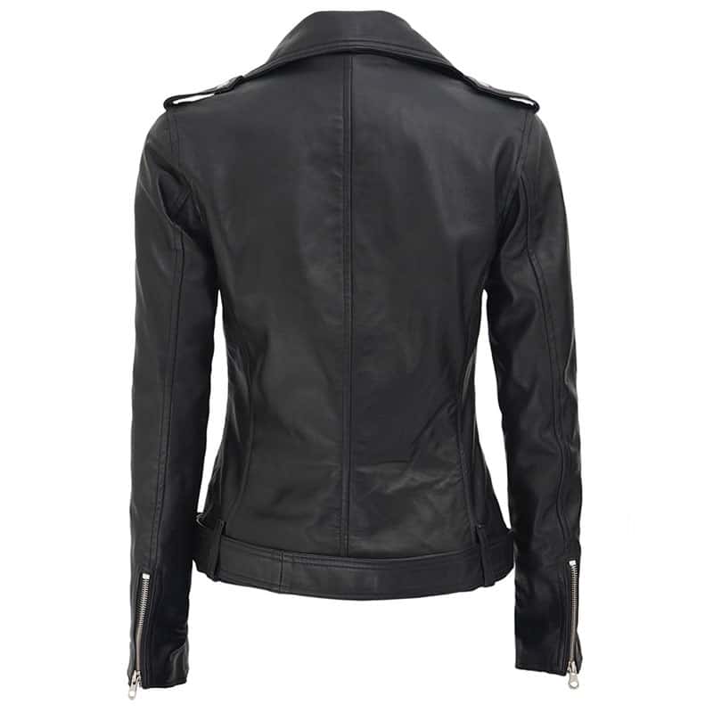 Ladies are always passionate about wearing trendy clothes. Here comes the Marcella Women’s Leather Black Biker jacket in stunning black. The jacket holds all good features, made with pure lambskin leather material, having smooth and quality inner viscose lining. The Marcella Women’s Leather Black Biker jacket is beautiful craft with asymmetrical collar with YKK branded zipper closure. There are three zipped and one flap interior pockets to carry stuff. The sold black jacket is regular fit to carry on any dress code.