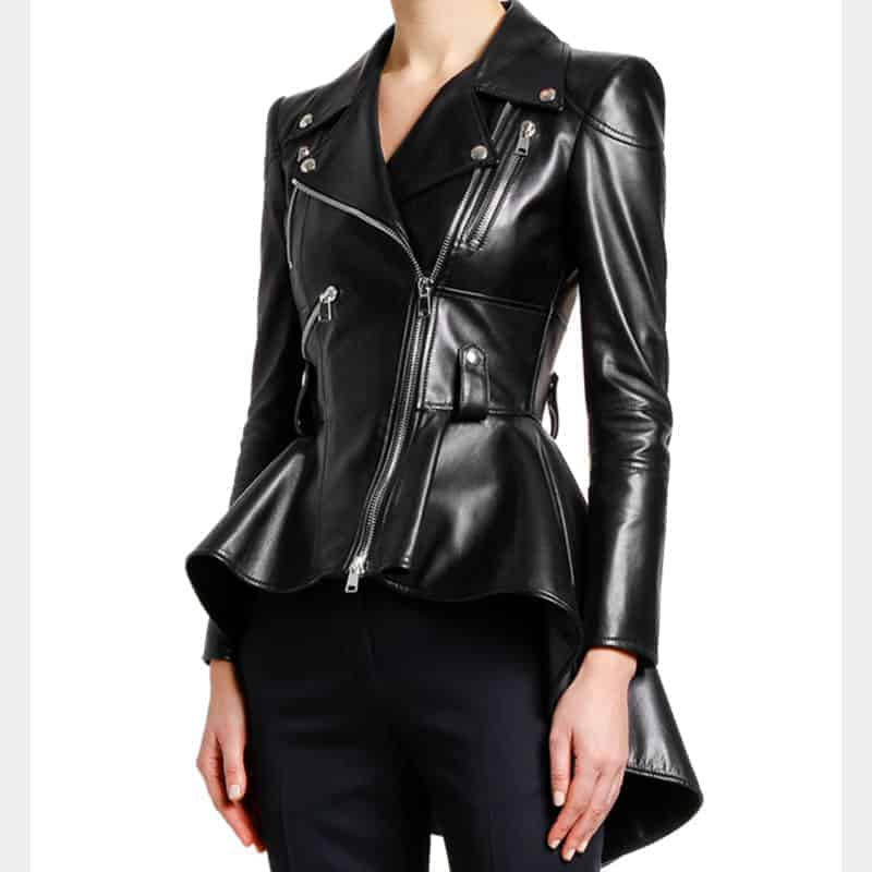 We produced another outstanding attire for women with a new look among all the beautiful and trendy collections—McQueen Black Leather jacket with creamy smooth, lofty, and super glossy skin in black. The pure leather comfy jacket is a lovely outfit with magnetic properties; an asymmetrical front with zipper closure, long open hem sleeves, front zipper, and inner pockets for your stuff are just perfect for carrying. McQueen Black Leather jacket has captured an ideal position in our collection at a reasonable price, in regular fitting, available in all sizes. Shop now and exchange your boring outfit with this beautiful jacket.