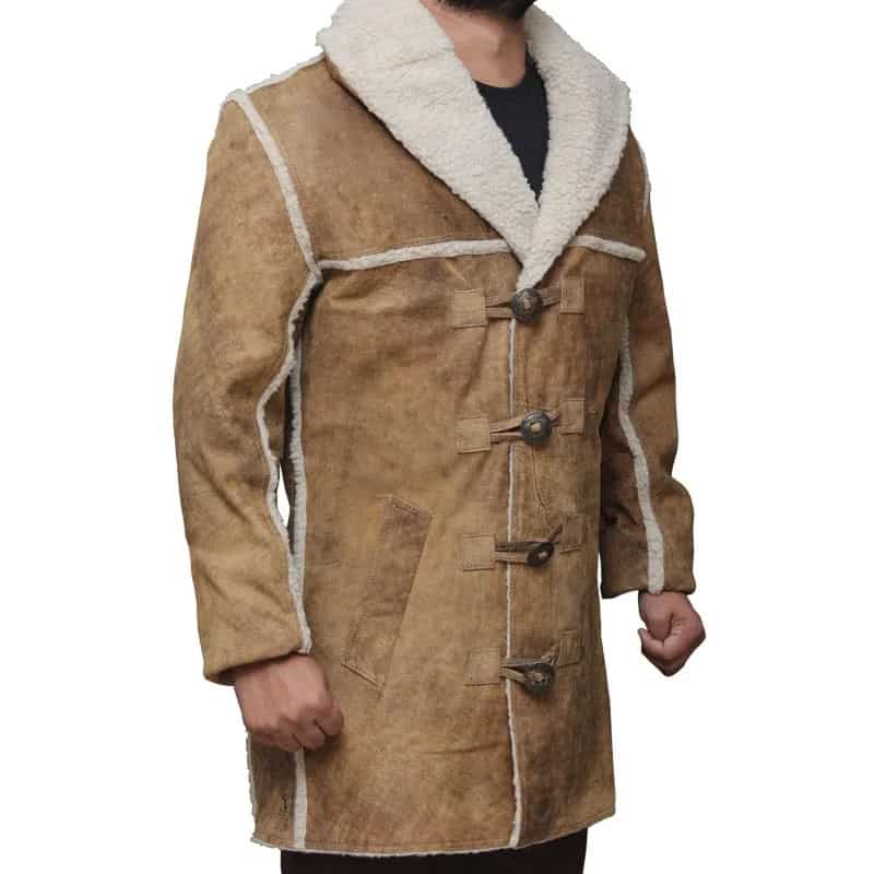 This mens Bohannon distressed windbreaker toggle closure suede shearling coat is made of top-notch calfskin leather. It combines with faux shearling on the collar that will keep you warm and safe. Firm sewed all through makes it solid and durable.