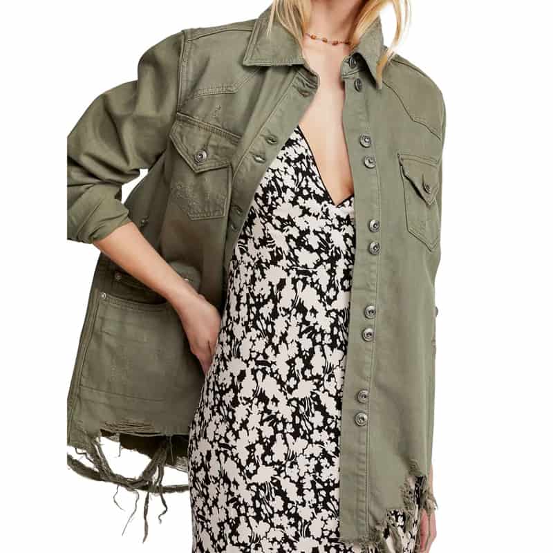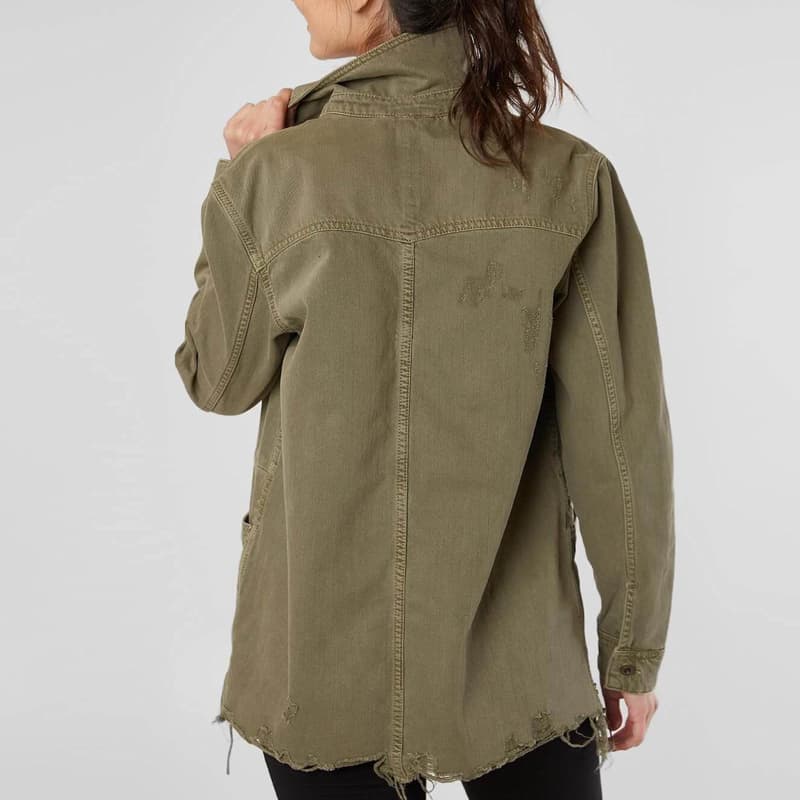 If you are looking to carry a cool jacket for casual or party use, then look at this Moonchild shirt jacket in olive green color. The attire satisfies itself by all excellent features having shirt collar design, a buttoned closure front. The plain shirt style jacket has double bust pockets and a raw trimmed bottom, giving it a trendy look. Hurry up! Grab this cool attire and give a chic look to your daily get up.