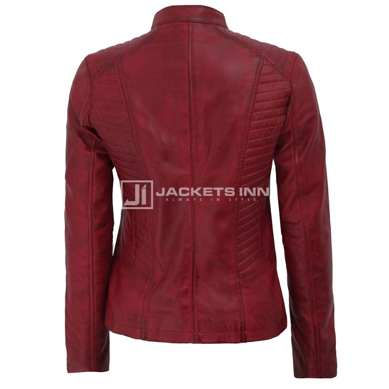 Do you need to hoist your style with something that sticks out? This Rachel womens maroon slim fit leather jacket is designed for you. It is made of excellent genuine cowhide and highlighted focal zip conclusion, mandarin collar, ribbed boards, two external pockets, and one inside pocket for utility. This original quality lambskin leather material has a lightly quilted and padded front with an inside viscose lining.