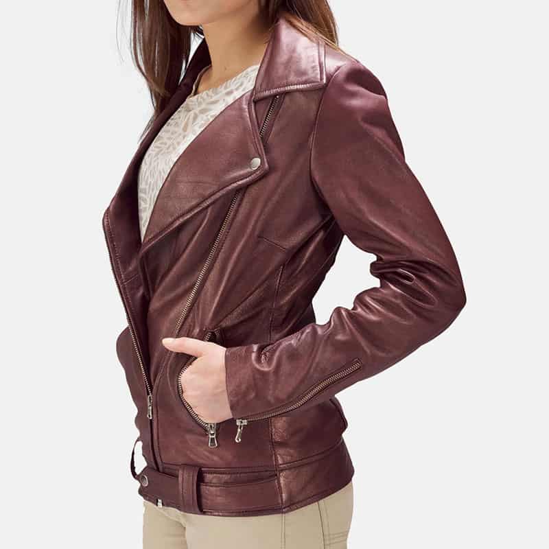 This Rumy maroon leather biker jacket is made up of sheepskin leather. Also, the aniline leather finish makes it even more outstanding. The quilted viscose lining that it has is one of the many amazing things about this leather jacket. The notch style collar is indeed common, but it does look perfect on it. This maroon color is just more than perfect for you to try on.