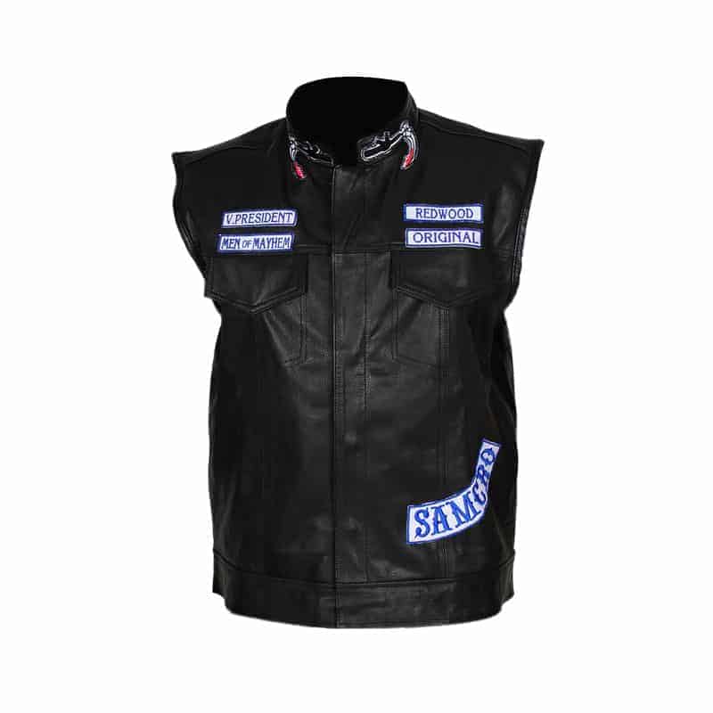 Sons of Anarchy vest is made with top-quality cowhide leather material. The inner side of this leather vest is stitched with a smooth and soft viscose lining that keeps you warm and comfy all the time. Jax Teller SOA leather vest comes in black color. It has a stand-up style collar. It has a branded zipper on the front side of this leather vest for closure. Charlie Hunnam Sons of Anarchy leather vest has two flap pockets on both sides of the chest, two on the waist, and two inside pockets to keep your small belongings safe and secure. It has a design of Sons of Anarchy California on the back of this vest as well. jacketinn love to bring this stylish design Son of Anarchy Vest which makes it appealing for motorcycle riders as well as fashion-savvy buyers.