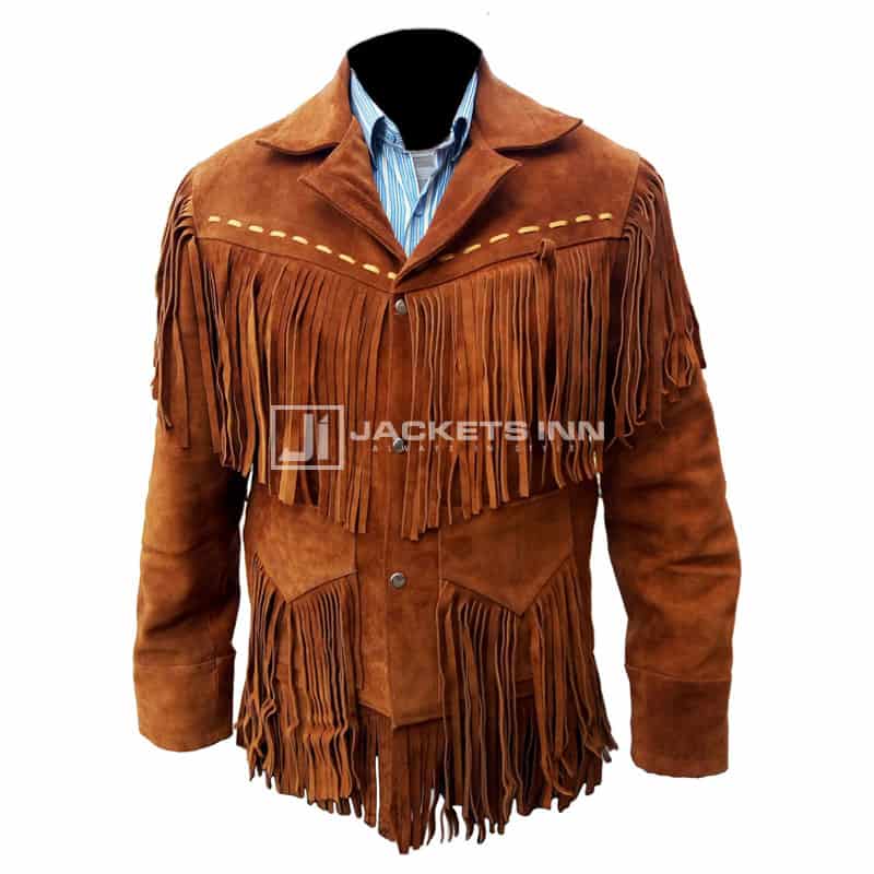 Western Suede Cowboy Leather jacket For Mens designed for Men is the most foreseeing outwear for our shoppers. Here you go! The brown Western Suede Cowboy Leather jacket For Men’s is pure leather material with finished suede material. The coat is stitched well with fringes, a front buttoned with fringes design closure, notched lapel design collar, long open hem cuff design sleeves, has inner pockets, making it classy. The jacket is perfect in dark brown with an attractive look and keeps the wearer prominent, among others. Pick up your phone and place your order. We feel pleasure to serve you.