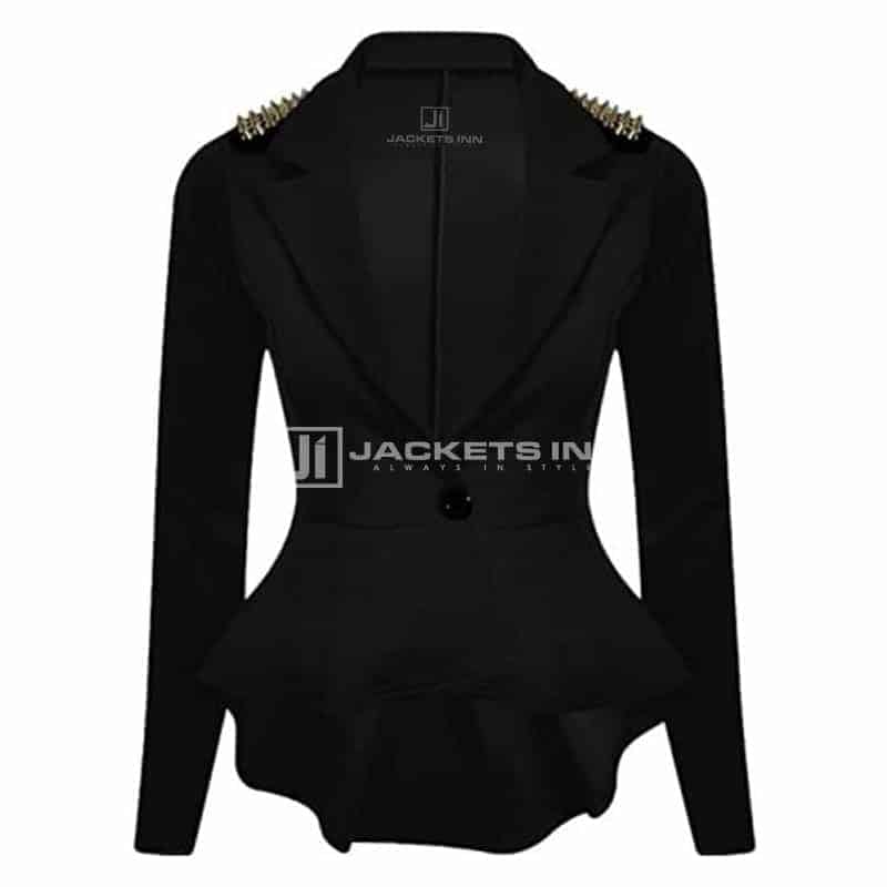 Women Spikes Studded Crop Peplum Frill Button Blazer