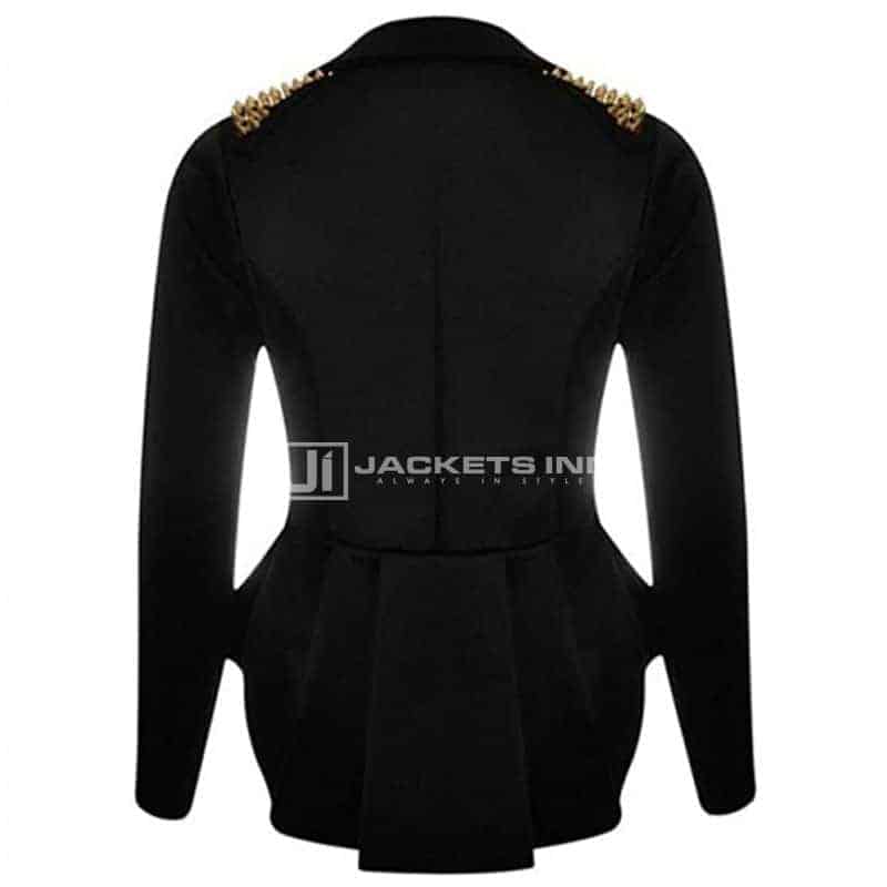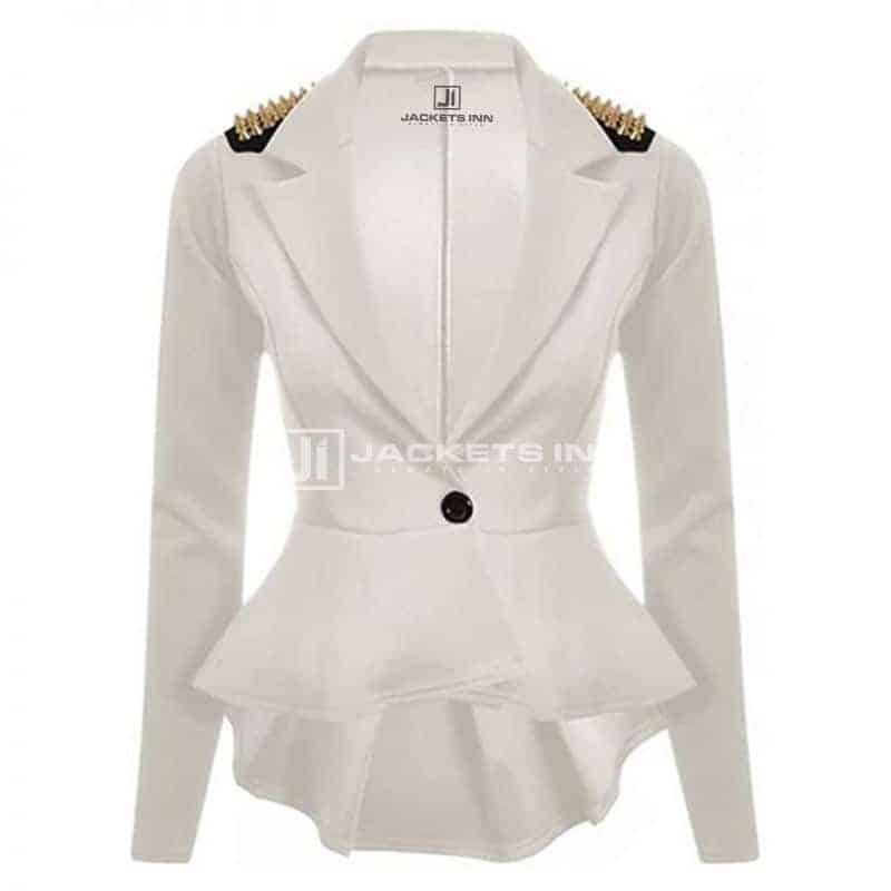 We bring you a Women Spikes Studded Crop Peplum Frill Button Blazer of cotton with soft and smooth fabric cotton of good quality for this upcoming Halloween event. The blazer is perfect in eye-catching purple color; it has impressive features like a front closure in button style, followed by a notched lapel collar design, long open hem sleeves having lovely cuffs. The shoulders of this beautiful blazer have studs with spikes of shiny golden color, giving it a fantastic look. The two inner pockets are making it more comfortable to carry. The attractive attire is available in all beautiful colors, black, white, purple, and others. To get a charming look, order this comfy warm blazer from our online store and make the party rocking!
