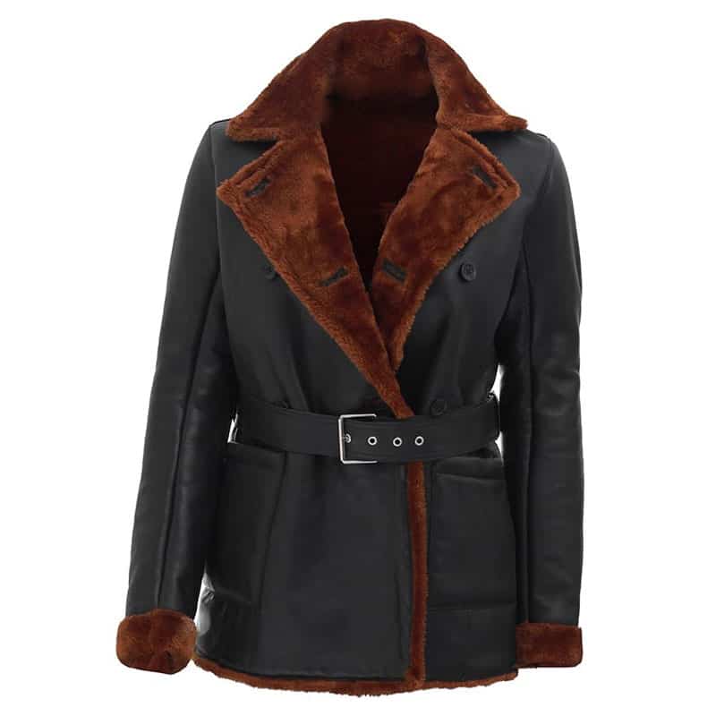 Astonish the world with this most current black double breasted shearling leather coat for women. It is designed from the first-rate quality calfskin leather material. A flawless plan depends on a shearling collar, lapels and sleeves, two open pockets on the abdomen, and a belt to make the fit more extraordinary. Shop this ¾ length shearling leather coat and make this colder time of year more delightful and modern.