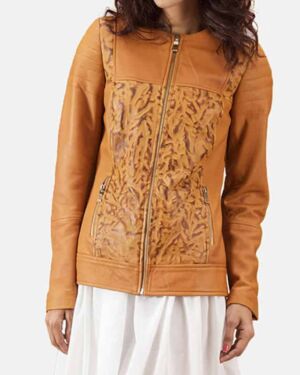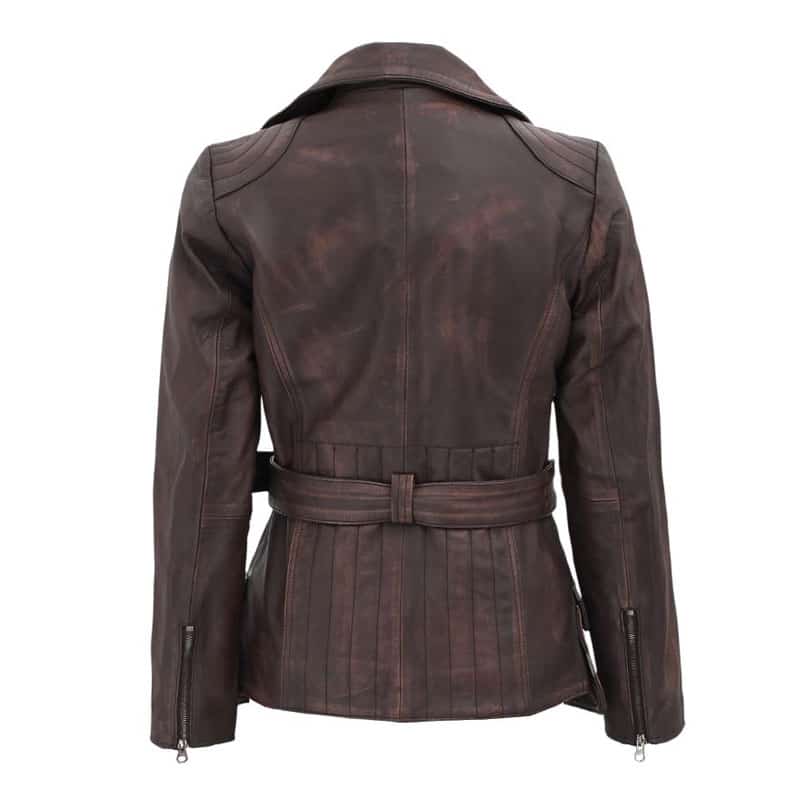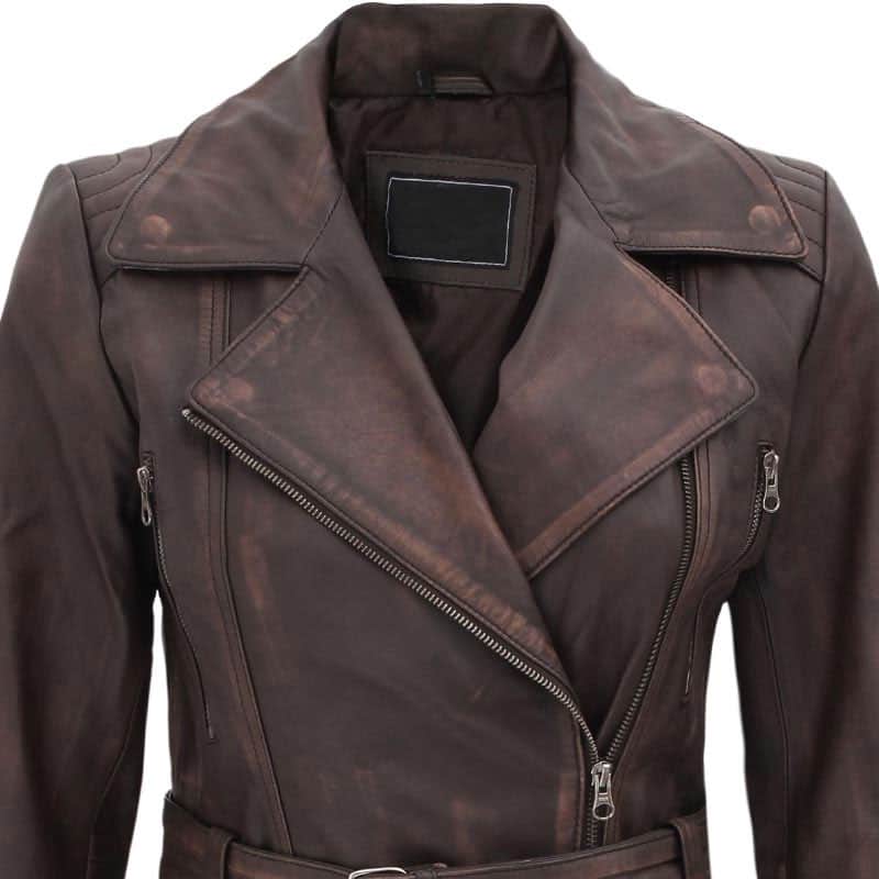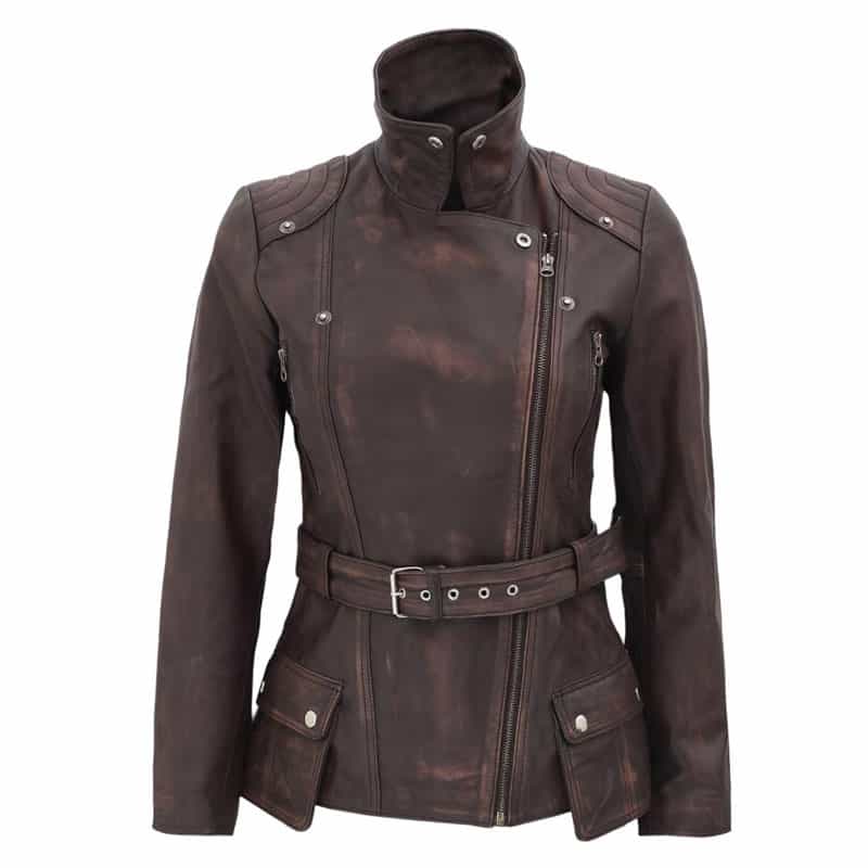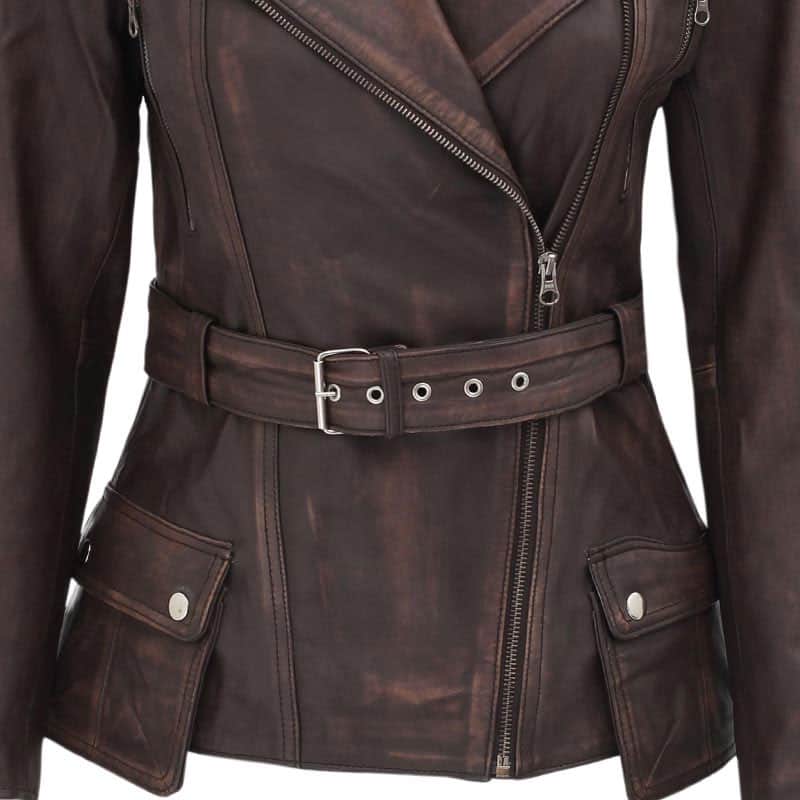 Womens Four Pocket Asymmetrical Distressed Brown Leather Biker jacket