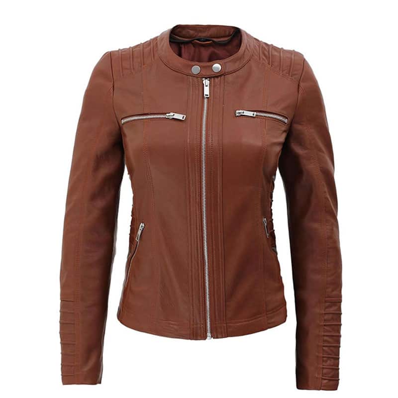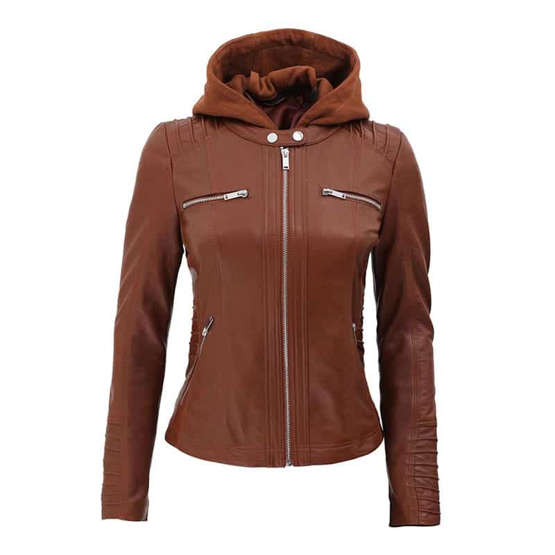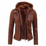 This incredible womens slim fit brown hooded leather jacket is made up of 100% genuine lambskin leather. It is fully lined with viscose material from the inner side that makes it comfortable to wear. Its hood can be removed, which gives us an option whether to keep it or not. Four fully zipped exterior pockets and one inside pocket allow us to keep our essential things in them.
